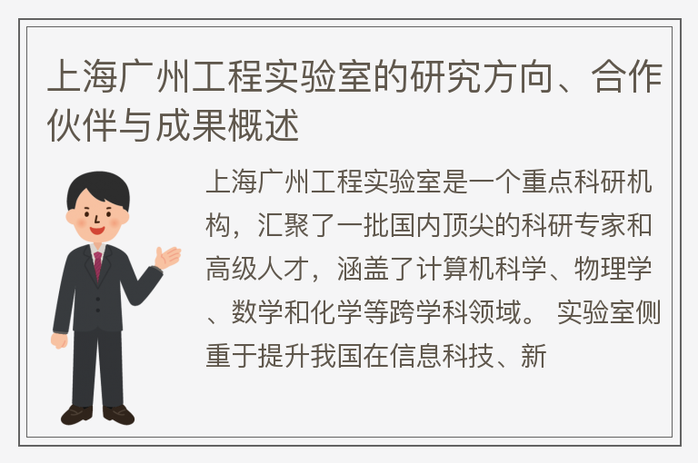 上海广州工程实验室是一个重点科研机构,汇聚了一批国内顶尖的科研专家和高级人才,涵盖了计算机科学、物理学、数学和化学等跨学科领域。