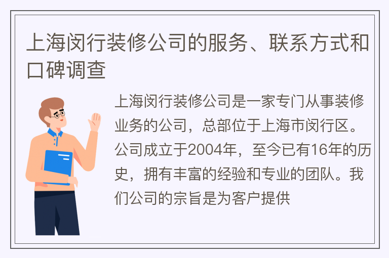 上海闵行装修公司是一家专门从事装修业务的公司,总部位于上海市闵行区。公司成立于2004年,至今已有16年的历史,拥有丰富的经验和专业的团队。我们公司的宗旨是为客户提供......【点击详情】