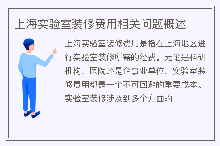 上海实验室装修费用是指在上海地区进行实验室装修所需的经费。无论是科研机构、医院还是企事业单位,实验室装修费用都是一个不可回避的重要成本。实验室装修涉及到多个方面的......【点击详情】