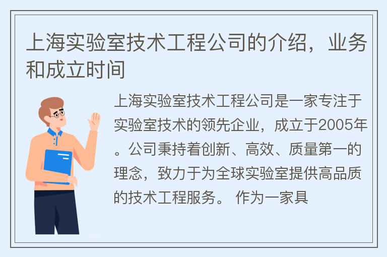 上海实验室技术工程公司是一家专注于实验室技术的领先企业,成立于2005年。公司秉持着创新、高效、质量第一的理念,致力于为全球实验室提供高品质的技术工程服务。 作为一家具......【点击详情】