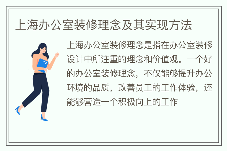 上海办公室装修理念是指在办公室装修设计中所注重的理念和价值观。一个好的办公室装修理念,不仅能够提升办公环境的品质,改善员工的工作体验,还能够营造一个积极向上的工作......【点击详情】