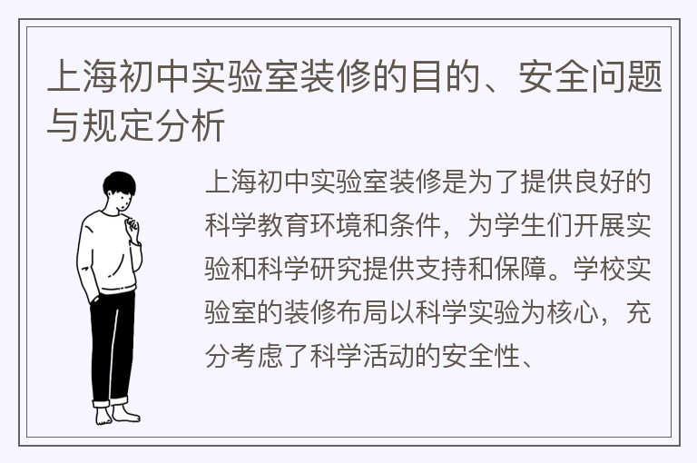 上海初中实验室装修是为了提供良好的科学教育环境和条件,为学生们开展实验和科学研究提供支持和保障。学校实验室的装修布局以科学实验为核心,充分考虑了科学活动的安全性、......【点击详情】