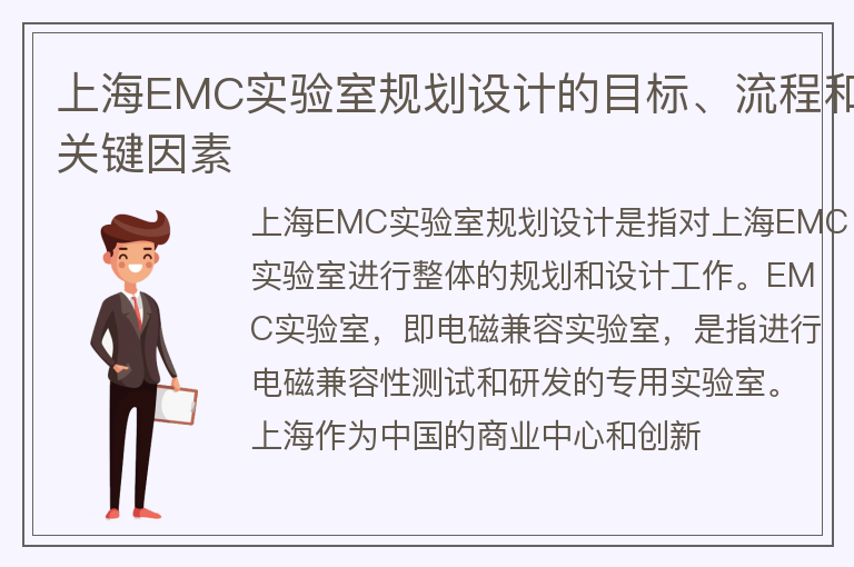 上海EMC实验室规划设计是指对上海EMC实验室进行整体的规划和设计工作。EMC实验室,即电磁兼容实验室,是指进行电磁兼容性测试和研发的专用实验室。上海作为中国的商业中心和创新......【点击详情】