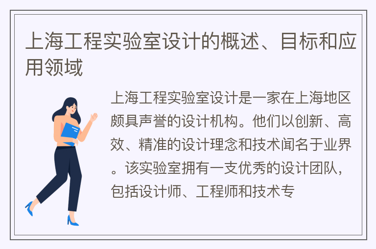 上海工程实验室设计是一家在上海地区颇具声誉的设计机构。他们以创新、高效、精准的设计理念和技术闻名于业界。该实验室拥有一支优秀的设计团队,包括设计师、工程师和技术专......【点击详情】