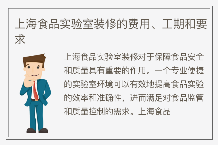 上海食品实验室装修对于保障食品安全和质量具有重要的作用。一个专业便捷的实验室环境可以有效地提高食品实验的效率和准确性,进而满足对食品监管和质量控制的需求。上海食品......【点击详情】