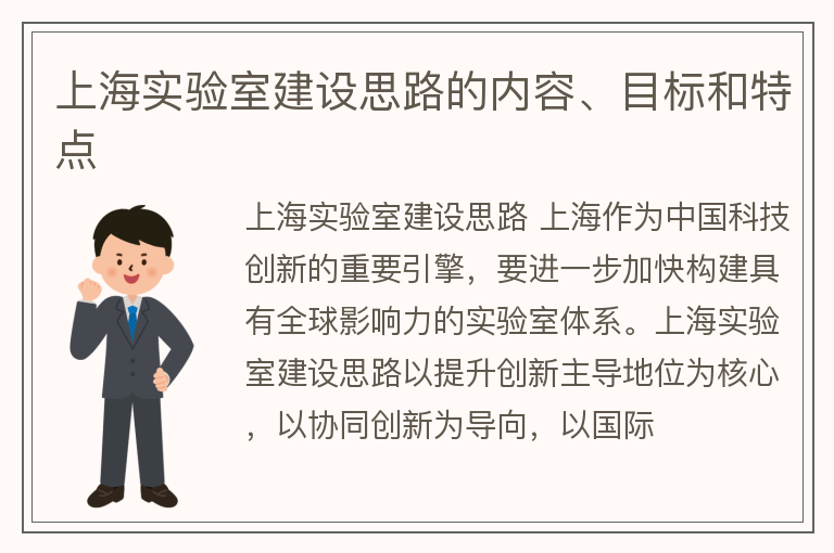 上海实验室建设思路 上海作为中国科技创新的重要引擎,要进一步加快构建具有全球影响力的实验室体系。上海实验室建设思路以提升创新主导地位为核心,以协同创新为导向,以国际......【点击详情】