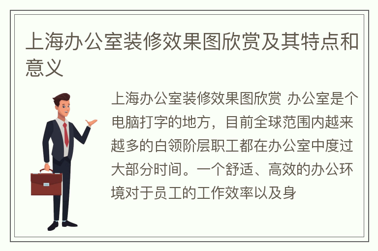 上海办公室装修效果图欣赏 办公室是个电脑打字的地方,目前全球范围内越来越多的白领阶层职工都在办公室中度过大部分时间。一个舒适、高效的办公环境对于员工的工作效率以及身......【点击详情】