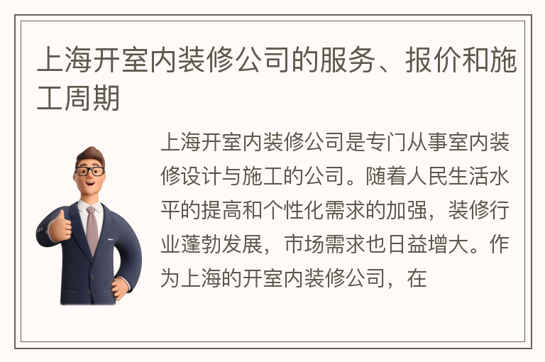 上海开室内装修公司是专门从事室内装修设计与施工的公司。随着人民生活水平的提高和个性化需求的加强,装修行业蓬勃发展,市场需求也日益增大。作为上海的开室内装修公司,在......【点击详情】
