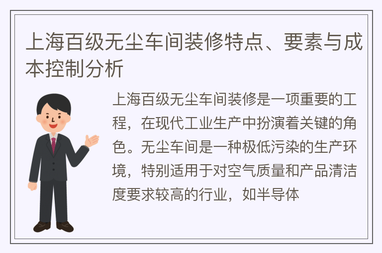 上海百级无尘车间装修是一项重要的工程,在现代工业生产中扮演着关键的角色。无尘车间是一种极低污染的生产环境,特别适用于对空气质量和产品清洁度要求较高的行业,如半导体......【点击详情】