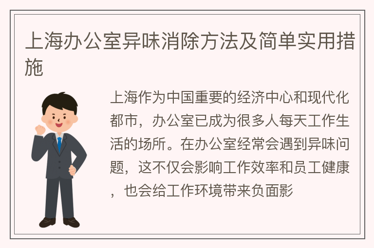 上海作为中国重要的经济中心和现代化都市,办公室已成为很多人每天工作生活的场所。在办公室经常会遇到异味问题,这不仅会影响工作效率和员工健康,也会给工作环境带来负面影......【点击详情】