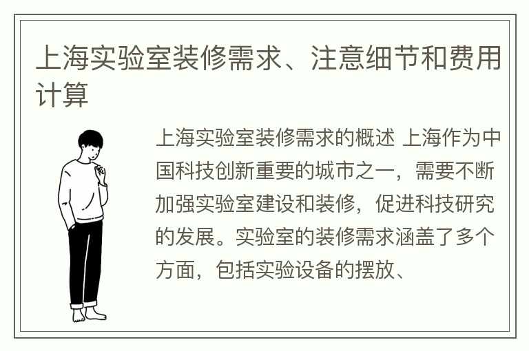 上海实验室装修需求的概述 上海作为中国科技创新重要的城市之一,需要不断加强实验室建设和装修,促进科技研究的发展。实验室的装修需求涵盖了多个方面,包括实验设备的摆放、......【点击详情】