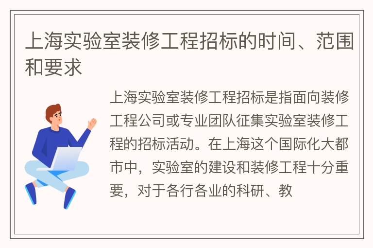 上海实验室装修工程招标是指面向装修工程公司或专业团队征集实验室装修工程的招标活动。在上海这个国际化大都市中,实验室的建设和装修工程十分重要,对于各行各业的科研、教......【点击详情】