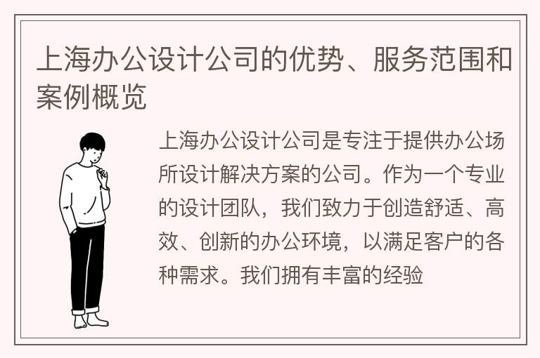 上海办公设计公司是专注于提供办公场所设计解决方案的公司。作为一个专业的设计团队,我们致力于创造舒适、高效、创新的办公环境,以满足客户的各种需求。我们拥有丰富的经验......【点击详情】