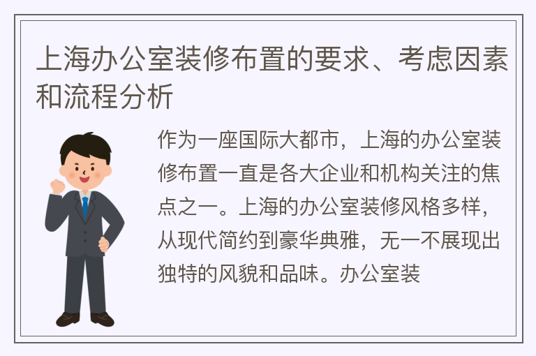 作为一座国际大都市,上海的办公室装修布置一直是各大企业和机构关注的焦点之一。上海的办公室装修风格多样,从现代简约到豪华典雅,无一不展现出独特的风貌和品味。办公室装......【点击详情】