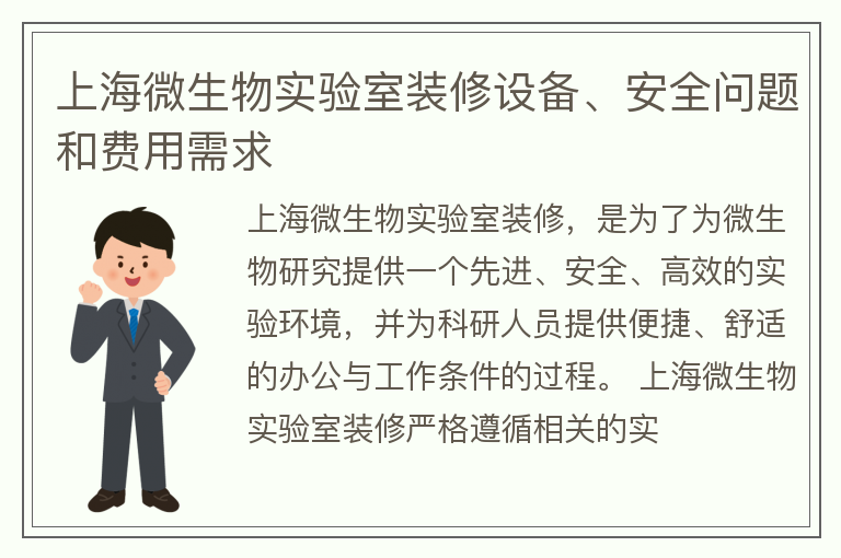 上海微生物实验室装修,是为了为微生物研究提供一个先进、安全、高效的实验环境,并为科研人员提供便捷、舒适的办公与工作条件的过程。 上海微生物实验室装修严格遵循相关的实......【点击详情】