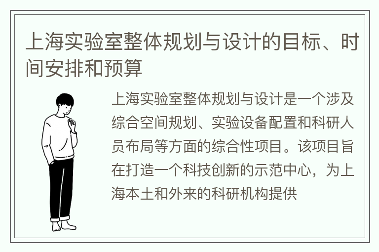 上海实验室整体规划与设计是一个涉及综合空间规划、实验设备配置和科研人员布局等方面的综合性项目。该项目旨在打造一个科技创新的示范中心,为上海本土和外来的科研机构提供......【点击详情】