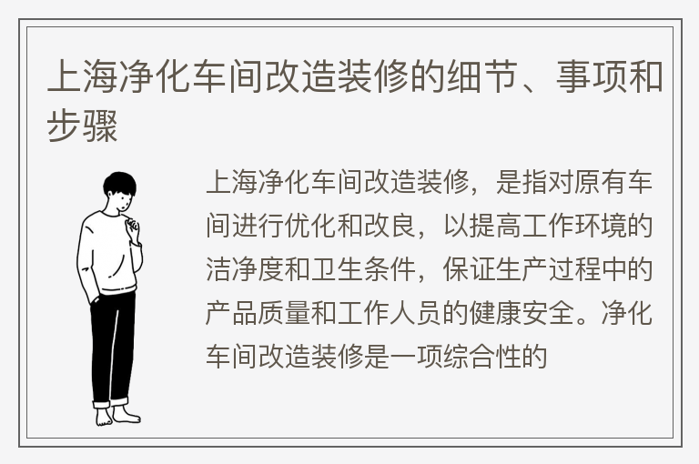 上海净化车间改造装修,是指对原有车间进行优化和改良,以提高工作环境的洁净度和卫生条件,保证生产过程中的产品质量和工作人员的健康安全。净化车间改造装修是一项综合性的......【点击详情】