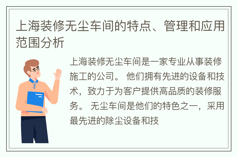 上海装修无尘车间是一家专业从事装修施工的公司。 他们拥有先进的设备和技术,致力于为客户提供高品质的装修服务。 无尘车间是他们的特色之一,采用最先进的除尘设备和技......【点击详情】