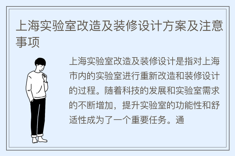 上海实验室改造及装修设计是指对上海市内的实验室进行重新改造和装修设计的过程。随着科技的发展和实验室需求的不断增加,提升实验室的功能性和舒适性成为了一个重要任务。通......【点击详情】