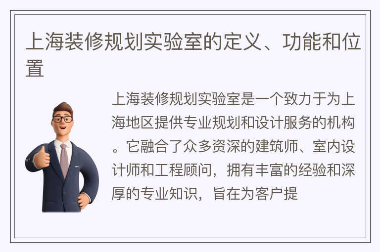 上海装修规划实验室是一个致力于为上海地区提供专业规划和设计服务的机构。它融合了众多资深的建筑师、室内设计师和工程顾问,拥有丰富的经验和深厚的专业知识,旨在为客户提......【点击详情】
