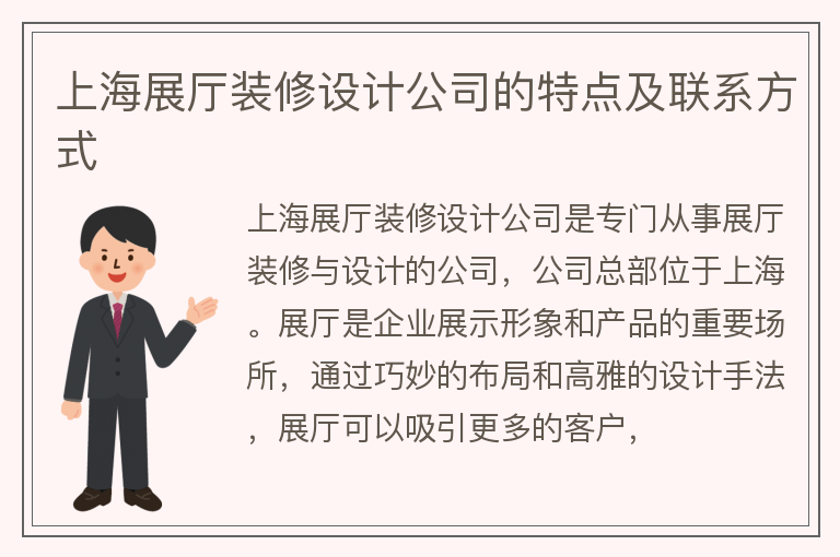 上海展厅装修设计公司是专门从事展厅装修与设计的公司,公司总部位于上海。展厅是企业展示形象和产品的重要场所,通过巧妙的布局和高雅的设计手法,展厅可以吸引更多的客户,......【点击详情】