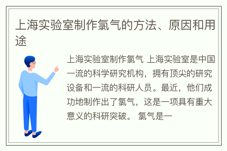 上海实验室制作氯气 上海实验室是中国一流的科学研究机构,拥有顶尖的研究设备和一流的科研人员。最近,他们成功地制作出了氯气,这是一项具有重大意义的科研突破。 氯气是一......【点击详情】