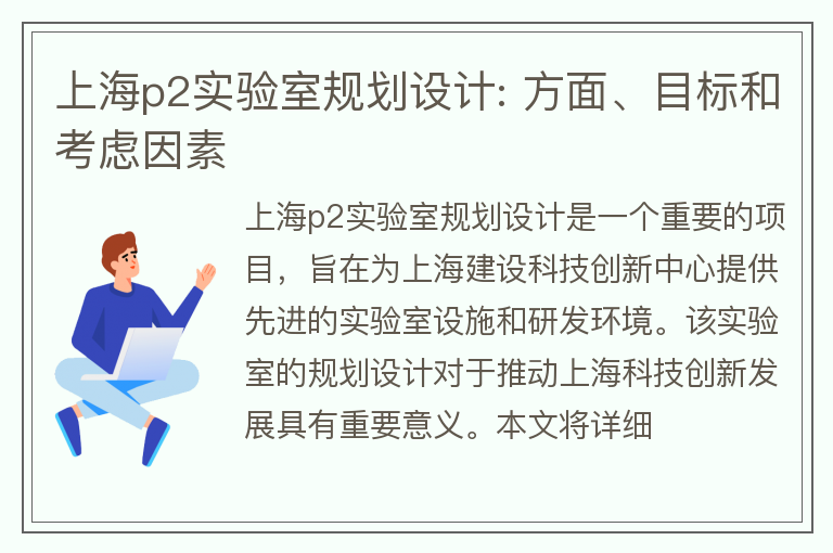 上海p2实验室规划设计是一个重要的项目,旨在为上海建设科技创新中心提供先进的实验室设施和研发环境。该实验室的规划设计对于推动上海科技创新发展具有重要意义。本文将详细......【点击详情】