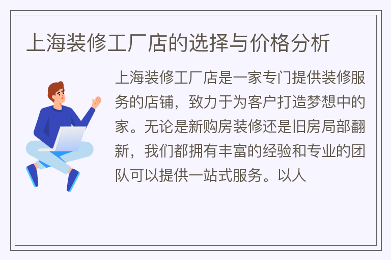 上海装修工厂店是一家专门提供装修服务的店铺,致力于为客户打造梦想中的家。无论是新购房装修还是旧房局部翻新,我们都拥有丰富的经验和专业的团队可以提供一站式服务。以人......【点击详情】