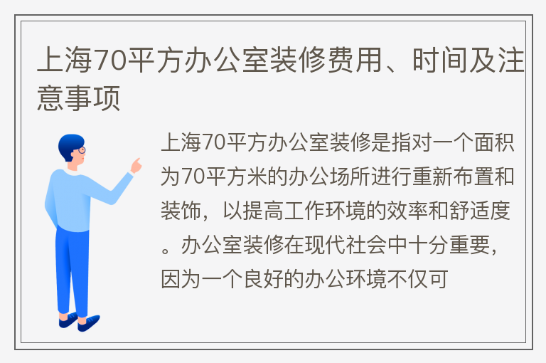 上海70平方办公室装修是指对一个面积为70平方米的办公场所进行重新布置和装饰,以提高工作环境的效率和舒适度。办公室装修在现代社会中十分重要,因为一个良好的办公环境不仅可......【点击详情】
