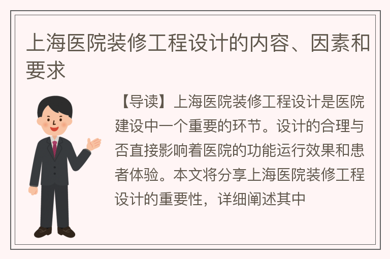 【导读】上海医院装修工程设计是医院建设中一个重要的环节。设计的合理与否直接影响着医院的功能运行效果和患者体验。本文将分享上海医院装修工程设计的重要性,详细阐述其中......【点击详情】