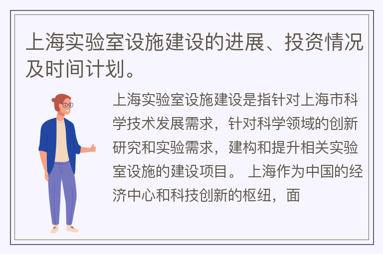 上海实验室设施建设是指针对上海市科学技术发展需求,针对科学领域的创新研究和实验需求,建构和提升相关实验室设施的建设项目。 上海作为中国的经济中心和科技创新的枢纽,面......【点击详情】