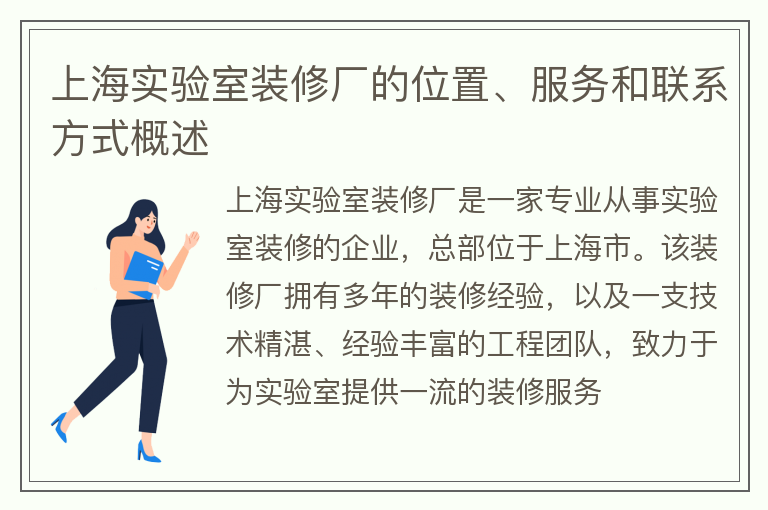上海实验室装修厂是一家专业从事实验室装修的企业,总部位于上海市。该装修厂拥有多年的装修经验,以及一支技术精湛、经验丰富的工程团队,致力于为实验室提供一流的装修服务......【点击详情】