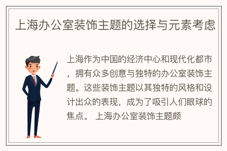 上海作为中国的经济中心和现代化都市,拥有众多创意与独特的办公室装饰主题。这些装饰主题以其独特的风格和设计出众的表现,成为了吸引人们眼球的焦点。 上海办公室装饰主题颇......【点击详情】