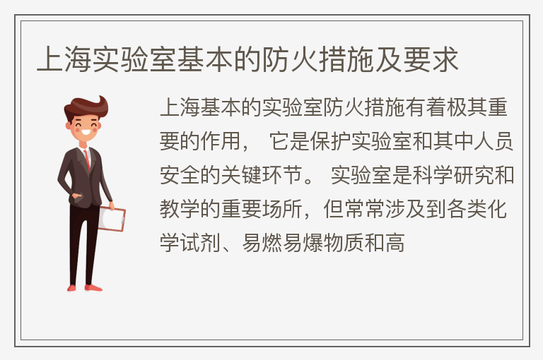 上海基本的实验室防火措施有着极其重要的作用, 它是保护实验室和其中人员安全的关键环节。 实验室是科学研究和教学的重要场所,但常常涉及到各类化学试剂、易燃易爆物质和高......【点击详情】