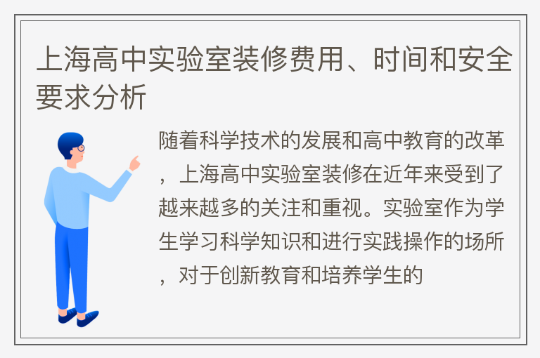 随着科学技术的发展和高中教育的改革,上海高中实验室装修在近年来受到了越来越多的关注和重视。实验室作为学生学习科学知识和进行实践操作的场所,对于创新教育和培养学生的......【点击详情】