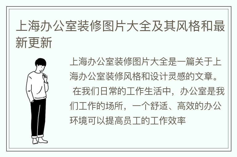 上海办公室装修图片大全是一篇关于上海办公室装修风格和设计灵感的文章。 在我们日常的工作生活中,办公室是我们工作的场所,一个舒适、高效的办公环境可以提高员工的工作效率......【点击详情】