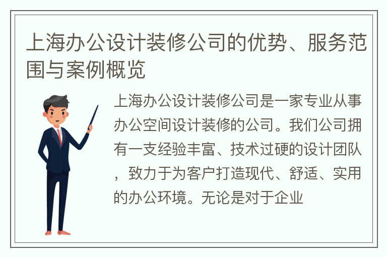 上海办公设计装修公司是一家专业从事办公空间设计装修的公司。我们公司拥有一支经验丰富、技术过硬的设计团队,致力于为客户打造现代、舒适、实用的办公环境。无论是对于企业......【点击详情】
