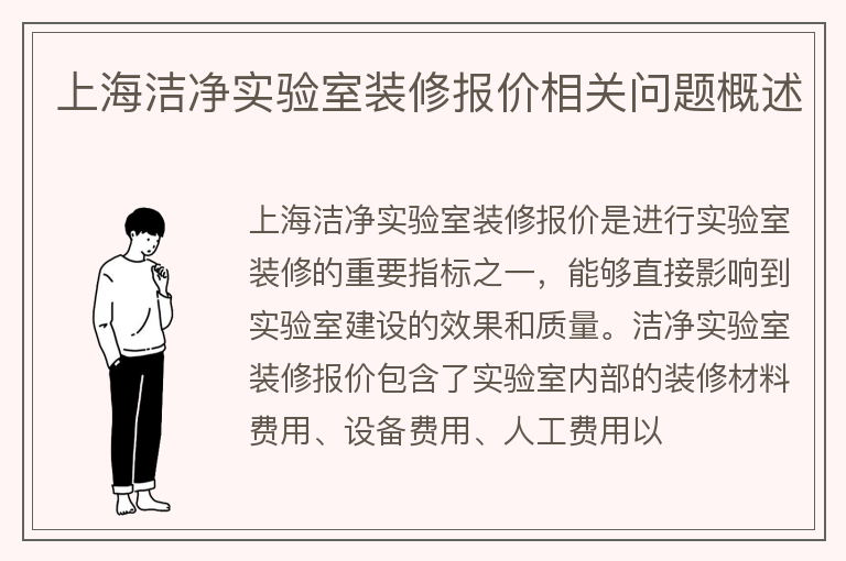 上海洁净实验室装修报价是进行实验室装修的重要指标之一,能够直接影响到实验室建设的效果和质量。洁净实验室装修报价包含了实验室内部的装修材料费用、设备费用、人工费用以......【点击详情】