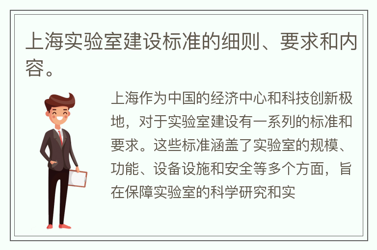 上海作为中国的经济中心和科技创新极地,对于实验室建设有一系列的标准和要求。这些标准涵盖了实验室的规模、功能、设备设施和安全等多个方面,旨在保障实验室的科学研究和实......【点击详情】