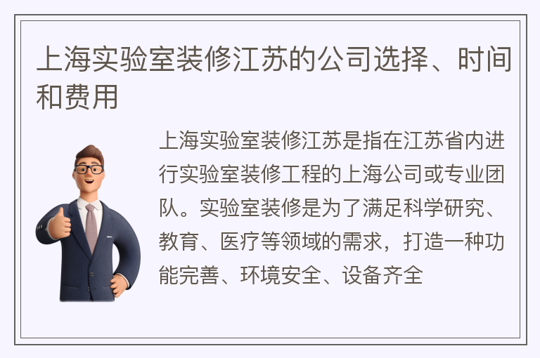上海实验室装修江苏是指在江苏省内进行实验室装修工程的上海公司或专业团队。实验室装修是为了满足科学研究、教育、医疗等领域的需求,打造一种功能完善、环境安全、设备齐全......【点击详情】