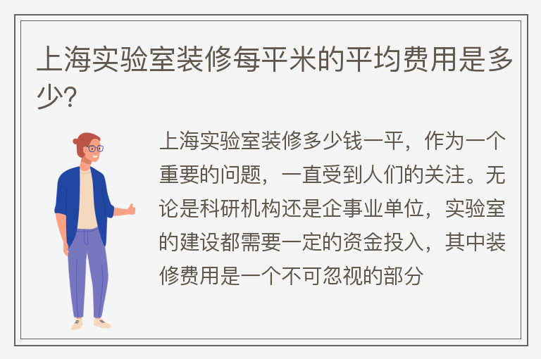 上海实验室装修多少钱一平,作为一个重要的问题,一直受到人们的关注。无论是科研机构还是企事业单位,实验室的建设都需要一定的资金投入,其中装修费用是一个不可忽视的部分......【点击详情】