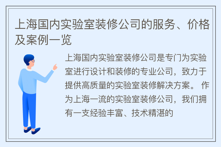 上海国内实验室装修公司是专门为实验室进行设计和装修的专业公司,致力于提供高质量的实验室装修解决方案。 作为上海一流的实验室装修公司,我们拥有一支经验丰富、技术精湛的......【点击详情】