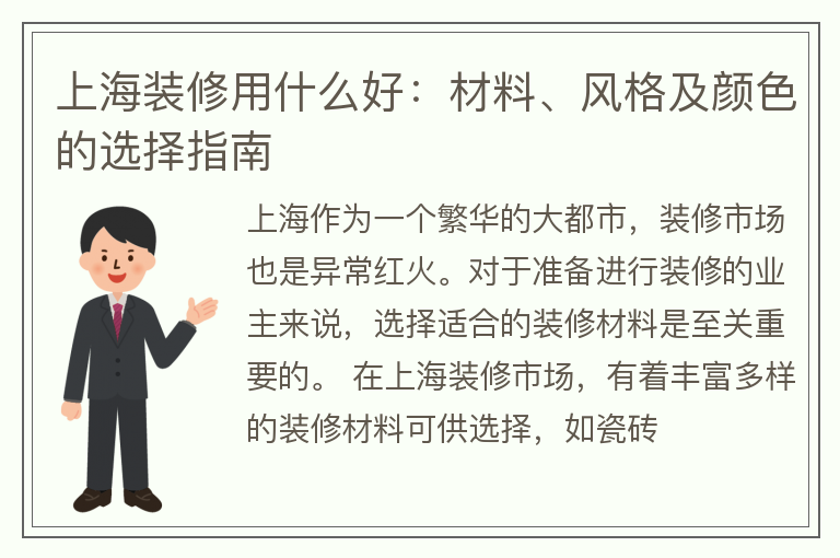 上海作为一个繁华的大都市,装修市场也是异常红火。对于准备进行装修的业主来说,选择适合的装修材料是至关重要的。 在上海装修市场,有着丰富多样的装修材料可供选择,如瓷砖......【点击详情】