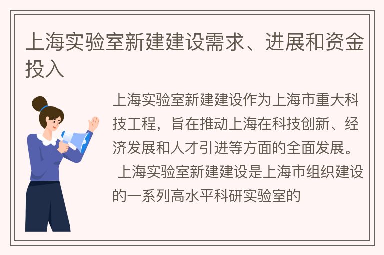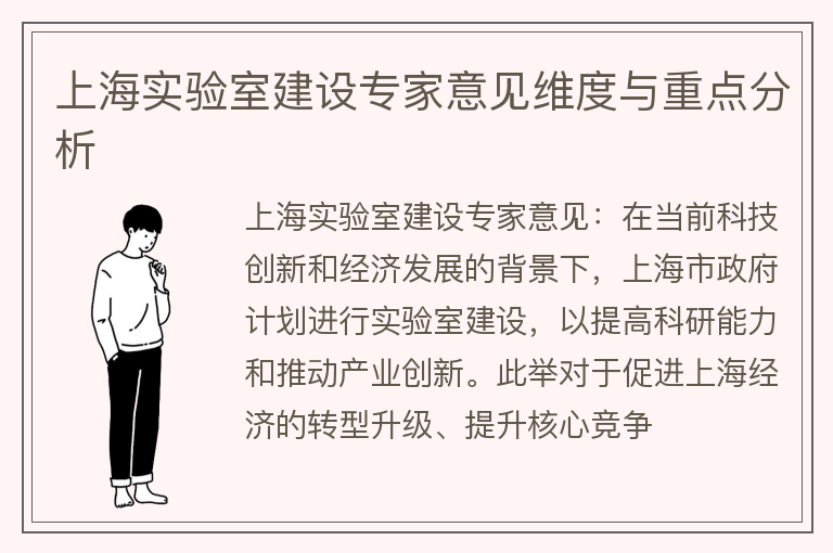上海实验室建设专家意见:在当前科技创新和经济发展的背景下,上海市政府计划进行实验室建设,以提高科研能力和推动产业创新。此举对于促进上海经济的转型升级、提升核心竞争......【点击详情】