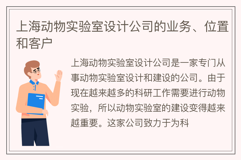 上海动物实验室设计公司是一家专门从事动物实验室设计和建设的公司。由于现在越来越多的科研工作需要进行动物实验,所以动物实验室的建设变得越来越重要。这家公司致力于为科......【点击详情】