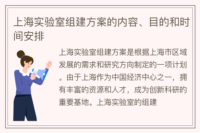 上海实验室组建方案是根据上海市区域发展的需求和研究方向制定的一项计划。由于上海作为中国经济中心之一,拥有丰富的资源和人才,成为创新科研的重要基地。上海实验室的组建......【点击详情】