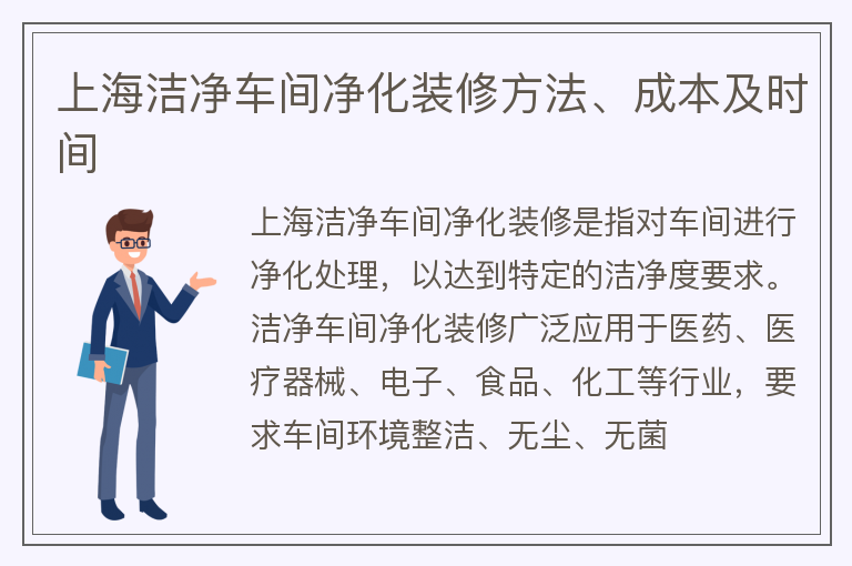 上海洁净车间净化装修是指对车间进行净化处理,以达到特定的洁净度要求。洁净车间净化装修广泛应用于医药、医疗器械、电子、食品、化工等行业,要求车间环境整洁、无尘、无菌......【点击详情】
