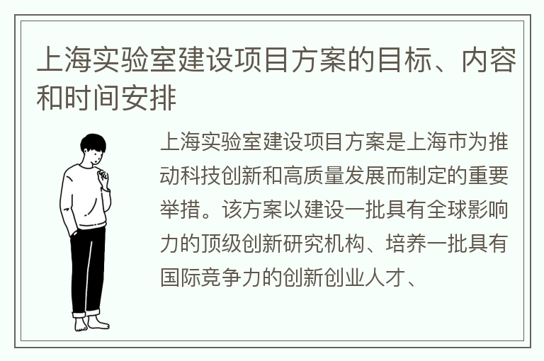 上海实验室建设项目方案是上海市为推动科技创新和高质量发展而制定的重要举措。该方案以建设一批具有全球影响力的顶级创新研究机构、培养一批具有国际竞争力的创新创业人才、......【点击详情】