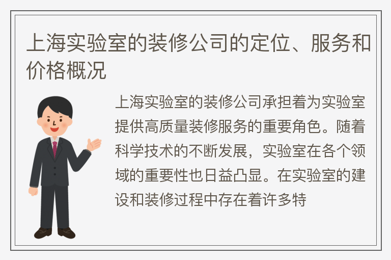 上海实验室的装修公司承担着为实验室提供高质量装修服务的重要角色。随着科学技术的不断发展,实验室在各个领域的重要性也日益凸显。在实验室的建设和装修过程中存在着许多特......【点击详情】