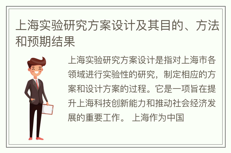 上海实验研究方案设计是指对上海市各领域进行实验性的研究,制定相应的方案和设计方案的过程。它是一项旨在提升上海科技创新能力和推动社会经济发展的重要工作。 上海作为中国......【点击详情】